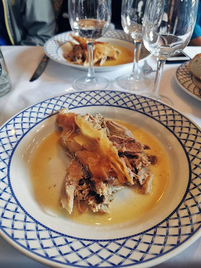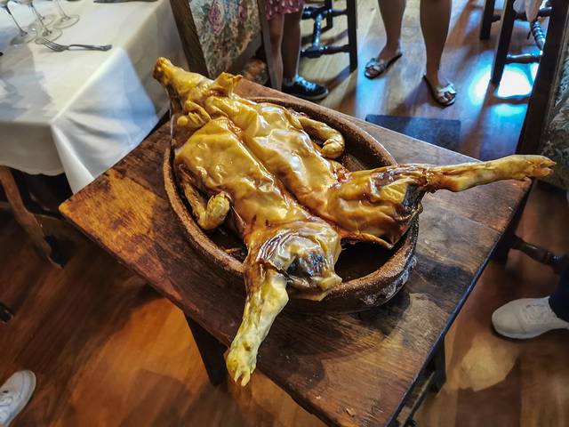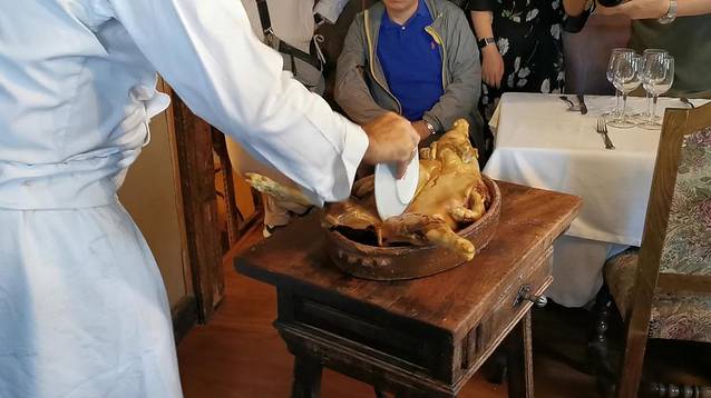 西班牙烤乳猪,是塞戈维亚著名的料理。这家百年老店的烤乳猪用未满三周的小猪烹制。烤好的乳猪被餐车推到桌前,老店的掌门人亲自来到桌前,用盘子将乳猪切分开来。我没有写错,是用盘子来切,表示乳猪已烤至酥嫩。这时你得注意,别被吓一大跳,切完乳猪,这位掌门人会毫无征兆突然的将盘子狠狠摔碎在地上,这可能是店里的传统吧。