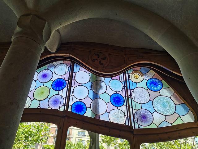 室内最为人熟知的是主厅。因为高迪的弧线,主厅里那扇著名的巨大落地窗像波浪一样涌动,窗上蓝色的、青色的、透明的圆圈是海中的气泡吗?我也不确定,但它让我联想到了海洋。