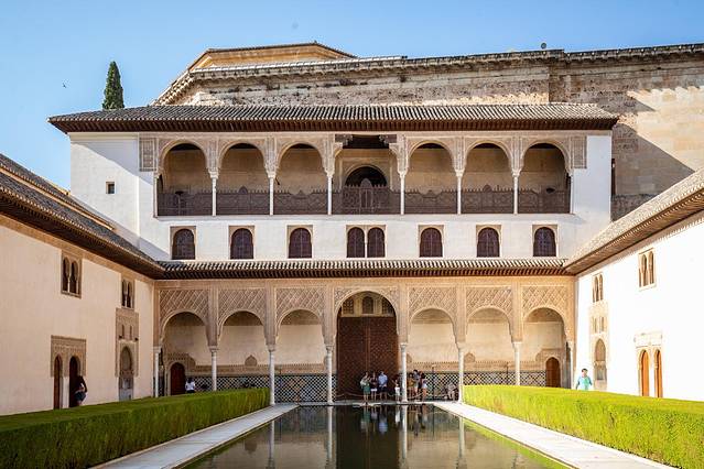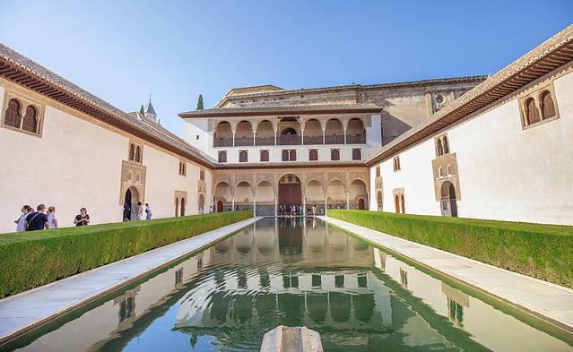 我比较推荐桃金娘中庭,它位于整个宫殿建筑群的中心,是阿尔汉布拉宫的标志性景观,因庭院里种植的桃金娘而得名。这些桃金娘是阿宫被西班牙人占领之后才种植的,名字应该是西班牙人取的。整个桃庭院被中间的平浅宽阔的矩形水池平均分割,呈现完美对称。水池像一面巨大的镜子清晰倒影出伊斯兰建筑纤细优雅的立柱撑起的七个拱门。