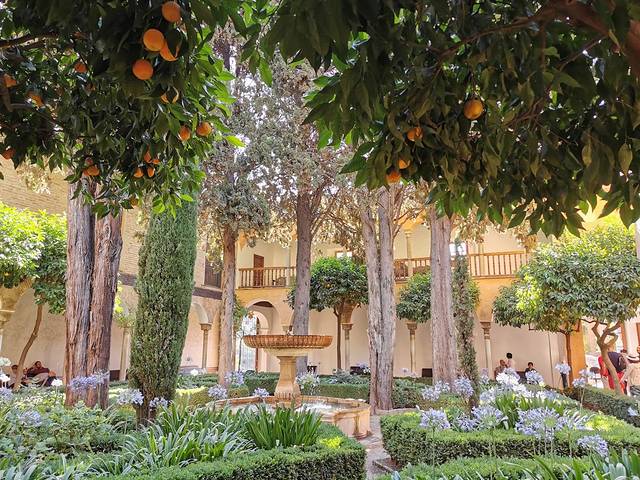 但我最喜欢的是达拉赛花园,它也叫橘子树花园。这个花园里种满了翠柏、金合欢、黄杨木及结满果实的橘子树,它们簇拥的花园正中的大理石喷泉却是文艺复兴式的。站在达拉赛花园里,觉得此刻橘子树下若是有人弹起那首最应景的曲子——《阿尔罕布拉宫的回忆》,那真是完美到令人心碎。这首轮指必练曲目来自西班牙国宝级的吉他大师塔雷加。古典吉他之于西班牙,也是一个不可不谈的关键词,只是我懂得太少,就不展开了。