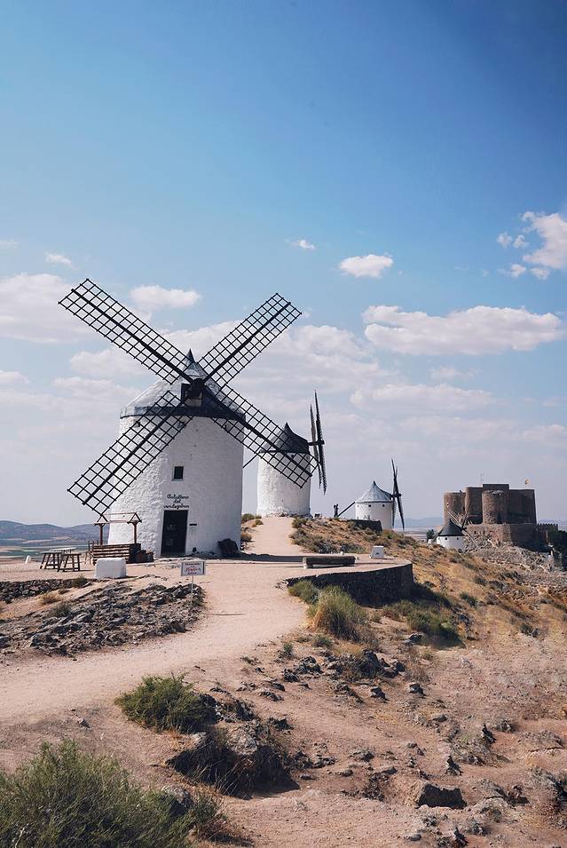 我们在烈日最毒辣的时刻路过这个白色风车小村庄,停车观望了一会儿,大家抵不住烈日,纷纷表示还是离开吧。这个小镇,西班牙文学史上最声名显赫的塞万提斯,他的著作《堂吉诃德》里的风车巨人的原型,就是这些兀自屹立在山顶的巨大的白色风车。
