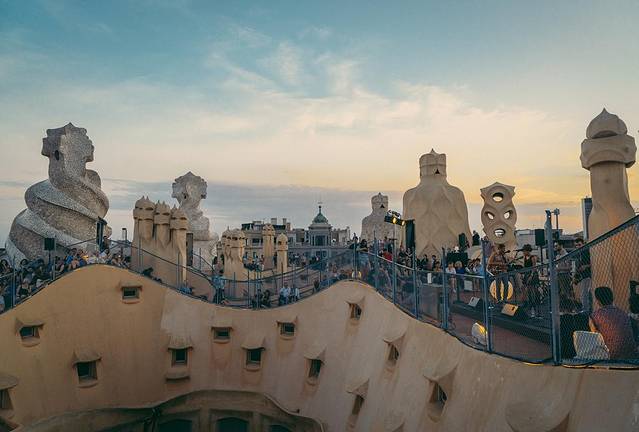 你可能没有听过米拉之家这个名字,但很可能在明信片和画册里看到过它的屋顶。“建筑物必须有双层屋顶,就像人要有帽子和伞一样”,高迪本人如是说。米拉之家最著名的就是它的屋顶,你们看那些奇形怪状的类似柱形的物体,有的是通风塔,有的是烟囱,有的是通往屋顶的楼梯。