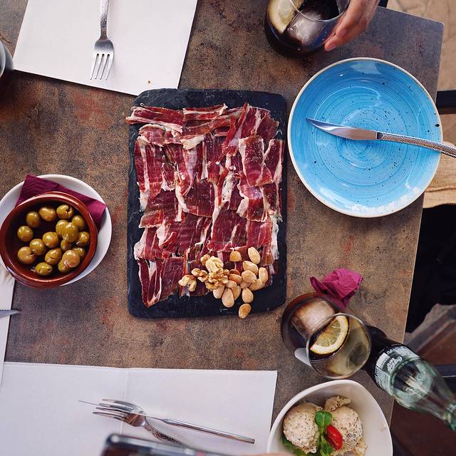 这家Tapas价格便宜,均价3、4欧一份,量也不算小。我们还点了一大份火腿,这是西班牙不可错过的美食之一。你如果跟我一样喜欢火腿,来到西班牙就是老鼠掉进了米缸了,全球最棒的火腿——伊比利亚火腿,就产自这里。国内售价较昂贵的火腿品牌Joselito的产品在这里会便宜很多,可惜带不回国,只能就地大快朵颐了。