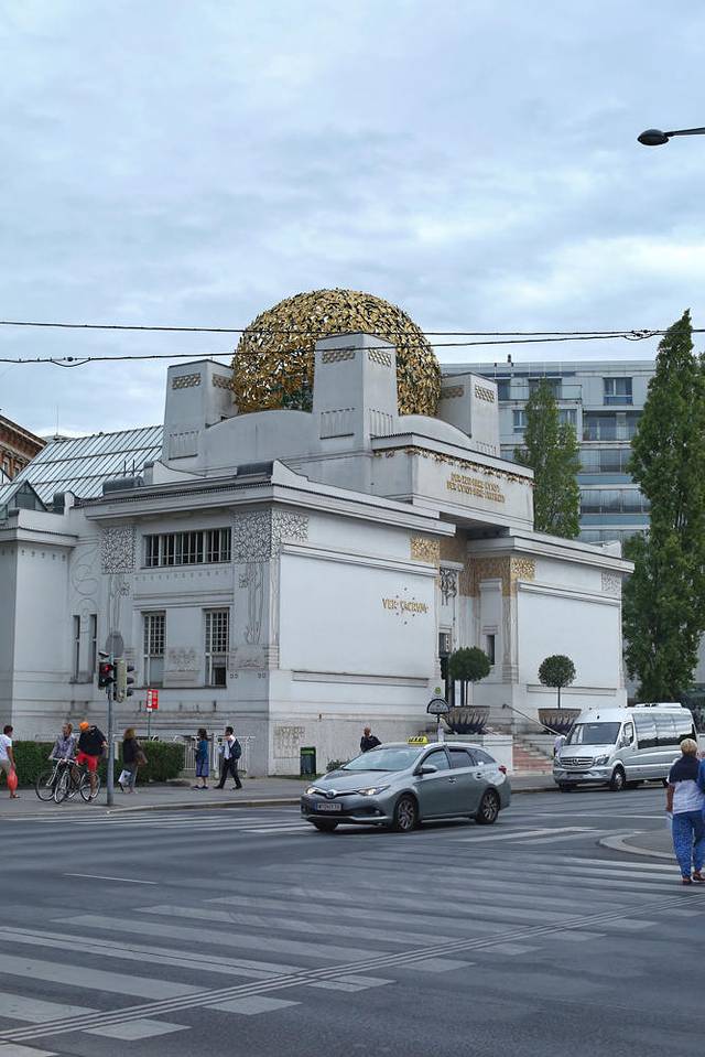 维也纳分离派这栋建筑物,本身非常漂亮,尤其是屋顶金色月桂叶组成的球形,夜幕时分在低色温的天空中显得格外耀眼。大门上三个蛇发女妖分别代表绘画、雕塑与建筑,门楣上写着分离派宣言:“每个时代有它的艺术,艺术有它的自由”。我住在分离派附近,每天来回都会看到它,兀自矗立在街头,金光灿烂。街对面是分离派艺术家们的聚集点——博物馆咖啡厅café museum。