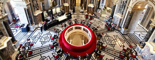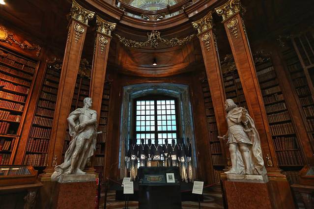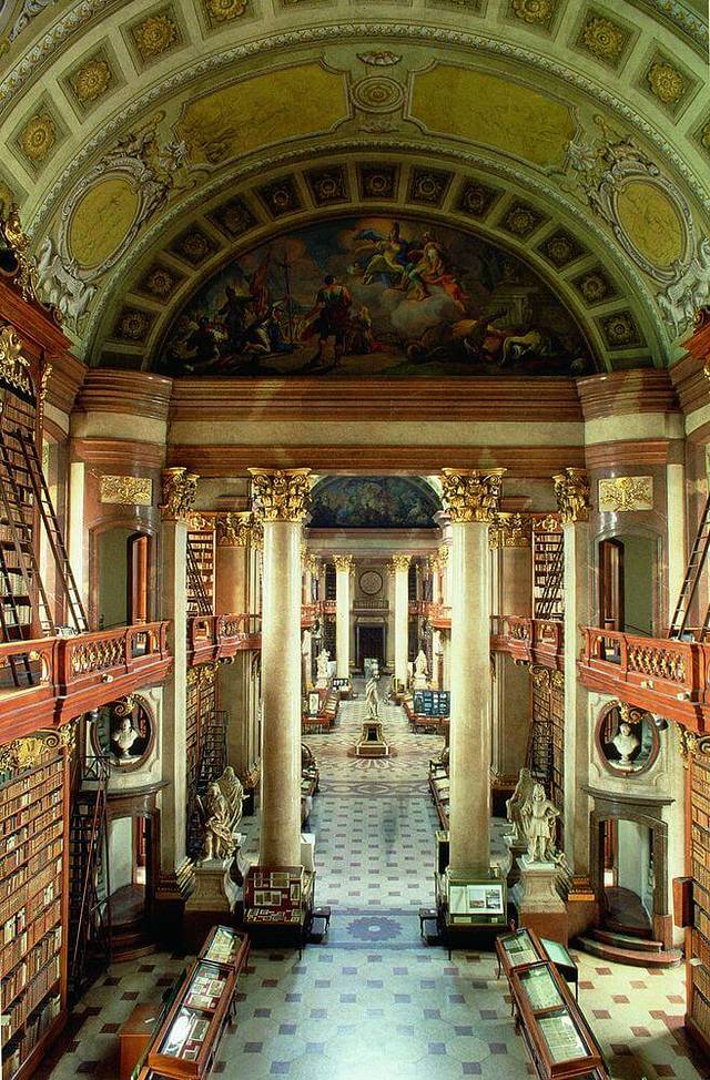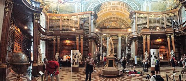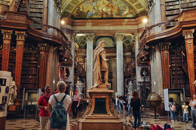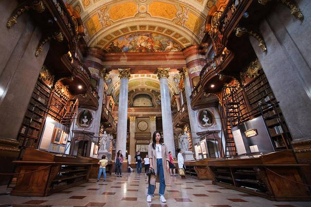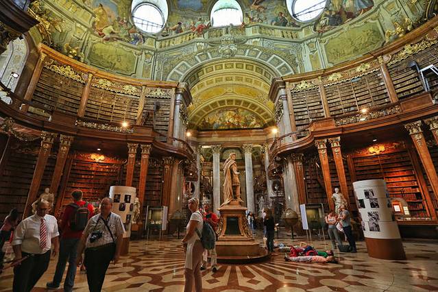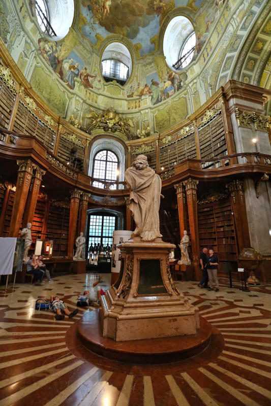 这个点本来行程里没有,在我要求下添加了。因为我是个图书馆收集者,我知道只有不平凡的建筑物,才能成为一个国家首都的图书馆。尤其是在欧洲,图书馆本身非常值得一观。奥地利国家图书馆的前身是哈布斯堡王朝的皇家图书馆,属于霍夫堡皇宫的一部分。奥匈帝国解体之后,改为“国家图书馆”,现在单独售票与进入。这里收藏着20多万卷古籍,一部分允许借到阅览厅内戴上手套阅读(我记得听人说有次一个借阅者不小心弄脏了书籍,所以现在书籍概不外借了。也有可能我记混了)。不过现在奥地利已经把这些书籍整理出了电子版,大家都可以查阅。现在图书馆的大厅供游人参观,标准的巴洛克式,富丽堂皇色彩浓烈,丝毫不逊色于布拉格修道院神学图书馆。
