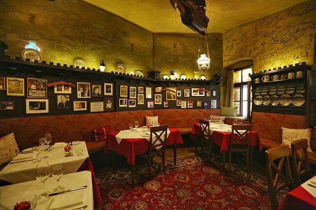 中世纪老店,开业时间1447年 这个中世纪老店开业于1447年,至今已快六百年。那些百年老店在它面前,也就是个稚嫩孩童而已。说起它大家可能都没听说过,但唱起一首歌,一定都听过,《Oh DuLieber Augustin》。我们小时候学习这首歌的中文名叫做《当我们同在一起》:“当我们同在一起,在一起,在一起,当我们同在一起,快乐无比。”歌词中唱到的Augustin奥古斯丁,正是原曲作者,他在Griechenbeisl里写出这首世界闻名的童谣。这里还有一个关于他和死神赌约的传说,有点长我不想写了,反正你们也不看字。
