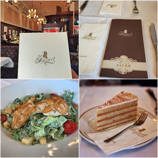 我在这里午饭,点了一份鸡胸肉凯撒沙拉14.5欧和一杯Mozart Kaffee,配了个小圆球装着的莫扎特酒,8欧。价格有些小贵,但论精致度和味道,是价有所值的。喜欢它家的小绿杯,维也纳机场有售。