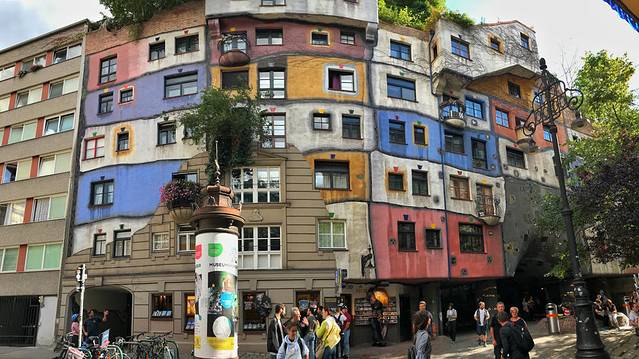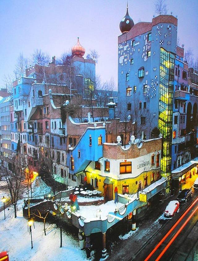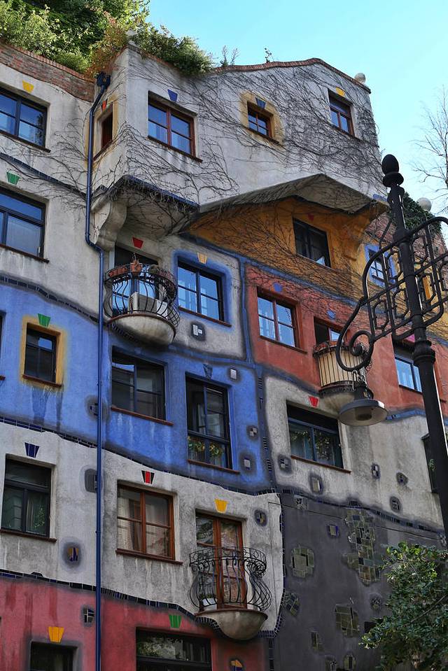 奥地利还有一个鬼才建筑师,百水先生,人称“奥地利高迪”。他是个古怪的艺术家,讨厌直线、对称、理论与规则。他的设计特点根本无需你去查阅资料,但凡看过一眼的人都忘记不了他的风格:童趣、绚烂、丰富、弯曲。