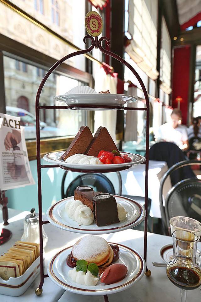 萨赫咖啡厅在奥地利国家歌剧院的背后,也总是排着长队。一杯招牌咖啡Sacherkaffee ,配了小杯萨赫酒,8.9欧,一套盛满各式精致甜品的萨赫塔,包含两块萨赫蛋糕,一套29欧。萨赫蛋糕单卖6.9欧一块。