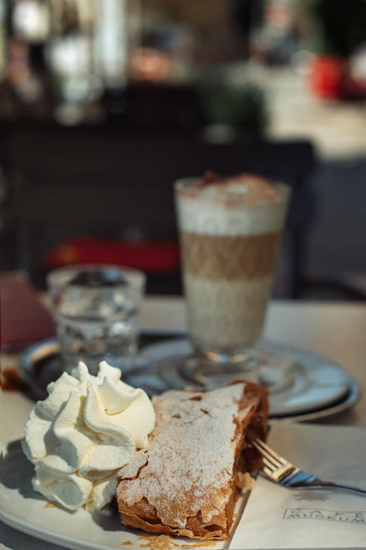 第二次是离开前的上午,我拖着行李箱准备前往斯诺伐克,心中满是对维也纳的依依不舍,去地铁站的途中经过Café Museum,坐在街边晒太阳,点了10欧的套餐:一杯拿铁和一款代表维也纳的经典甜品Wiener Apfelstrudel。