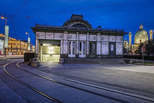 顺带再说一个奥托·瓦格纳的作品,卡尔广场城铁站,因为是当年为老皇帝修建的车站,所以也叫“国王车站”,但老皇帝本人一次也没享受过。它属于新艺术运动中维也纳分离派的代表作,作为车站算是非常漂亮了。我发现维也纳在新艺术运动时期非常喜欢用绿色和金色的搭配,大量使用自然系的花卉和藤蔓。后来维也纳规划地铁线路时,准备拆掉它,民众强烈反对得以保存。现在这里是个咖啡馆。我路过好几次,都没拍照片,说了这么多,不给你们看就也不行,网上扒了一张。(如有冒犯请告知)