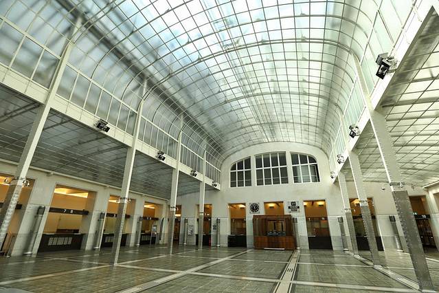 银行外立面非常简洁,没有繁复图案和雕塑。砖块砌筑,外层用铆钉固定住大理石板,既省钱又省时。运用了铝和玻璃这类当时的新兴材料。整个大厅的顶都是玻璃天花,你再低头看看脚底,踩着的地面也是透光的玻璃,地下层的工作区域便也拥有了较好的光线。