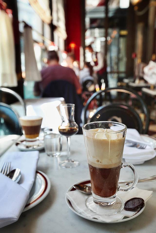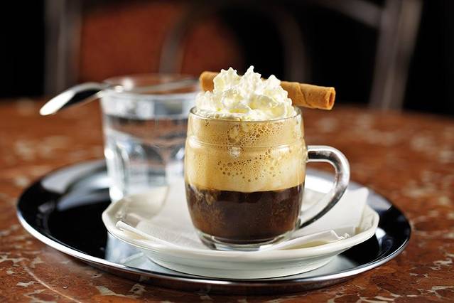 维也纳的咖啡单通常都会分为两类。一类普通咖啡,比如latte和奥地利国饮melange(类似cappuccino)。另一类是coffee specialities,这些就是维也纳人偏爱的花式咖啡,要么顶着厚重奶油,要么添加不同口味的酒精,再撒点诸如橙皮丝之类的小装饰。比如一款叫做Einsp?nner的咖啡,中文叫“单驾马车”。当年奥匈帝国的马车夫们为了在冷天喝上热咖啡,往咖啡顶上注入大量奶油,使咖啡不至于很快冷却,且一手驾车一手持杯,咖啡也不容易洒出来。据说里面还加了朗姆酒,这应该算是酒驾吧?