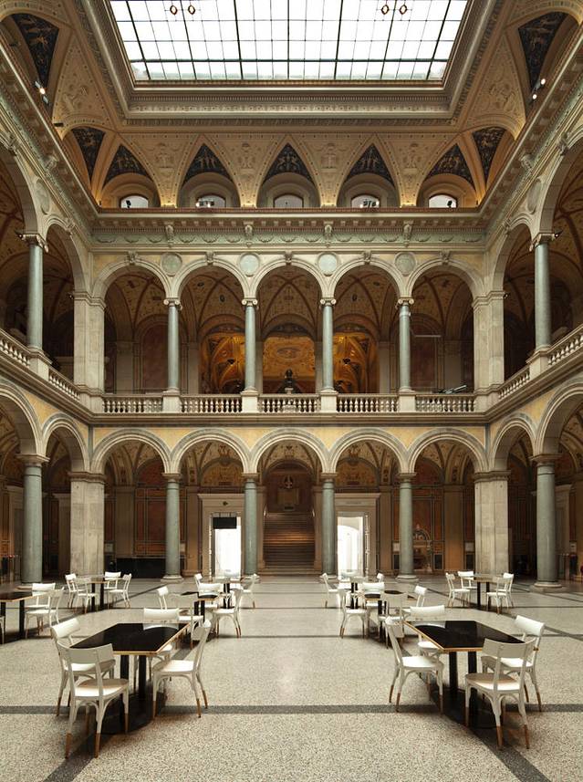 Café Mozart位置也在国家歌剧院附近,萨赫咖啡厅拐角边,正对着阿尔贝蒂娜博物馆。1794年Georg P?hlein创办这间咖啡馆的前身时,国家歌剧院、阿尔贝蒂娜博物馆这些代表维也纳的知名建筑还都不存在。后来咖啡馆几经易主,1825年,它在西蒙·克拉手里成为维也纳第一个露天咖啡厅。之后经历战时萧条,再次复苏,逐渐占据了维也纳咖啡馆举足轻重的位置,吸引了大量记者、作家和歌剧院里的乐手、歌手及舞者等。一时间,好像整个维也纳都在这个小小的咖啡馆里相聚。