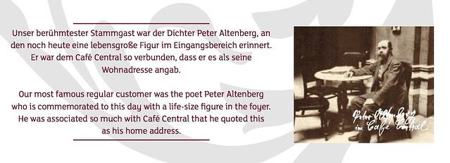没想到这句流行于咖啡文化里的经典slogan,竟然源于维也纳,我本以为它来自意大利或者巴黎。维也纳诗人Peter Altenburg,当年长期泡在中央咖啡馆里写作,甚至一度将收信地址改成了咖啡馆地址,这句话就是他的真实写照,其中提到的咖啡馆,正是指中央咖啡馆。作为诗人,Peter Altenburg或许并没有传世佳作,但时至今日,当你踏入中央咖啡馆,就会看到入口处蛋糕橱柜边有一个真人比例的光头胡子大叔塑像坐在一张咖啡桌旁。这是中央咖啡馆为了纪念他,为其保留的专属座位,你也可以在菜单上看到他的故事。
