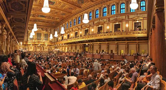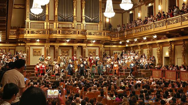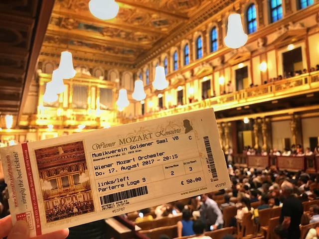 除了三大宫殿,全球游客趋之若鹜的景点便是金色大厅了。对于音乐,我虽然热爱,但其实并不十分热衷古典乐,只是金色大厅这四个字如雷贯耳,像魔咒一般让我迫切的向往着这个音乐圣殿。哪料每年7、8月奥地利的大乐团都在休假,没错,他们休假几乎整整一个夏天。于是,全球公认演奏水准最高的爱乐乐团,与我失之交臂。还好有一个成立于1986年的年轻小乐团仍在summer break中为人们演出,维也纳莫扎特交响乐团。我到达的当天,正好是他们在金色大厅演奏的最后一晚,从第二天开始他们便会将演出地址挪到国家歌剧院。为了完成在金色大厅听一场音乐会的执念,顾不上时差,我意志坚定的定了当天的音乐会门票。