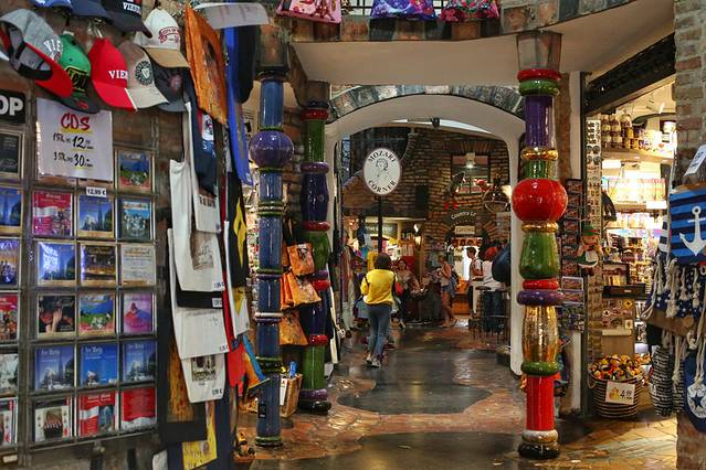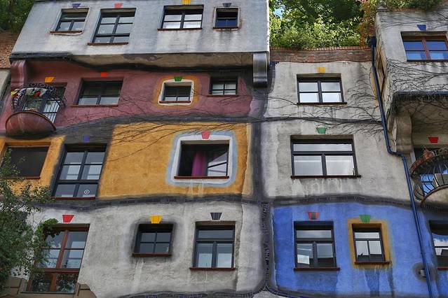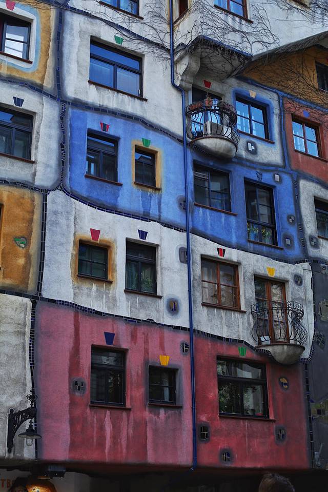 百水公寓最初是维也纳市政府为低收入家庭修建的廉租房,不知道现在还是不是廉租房,如果是的话,一定是全维也纳最抢手的廉租房。你在这童话中的斑斓楼房中找不到一条直线,百水先生强调自然与人共存,所以建筑的内外都刻意设计的大量植物与之相依附。
