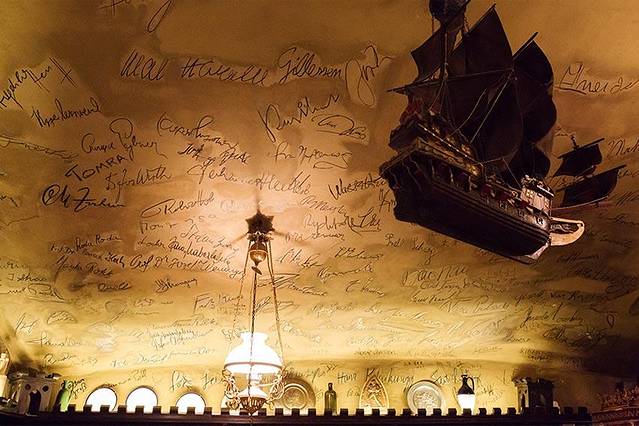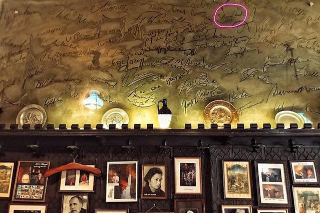 开业近六百年,Griechenbeisl鉴证了欧洲几个王朝的更迭和奥地利这几百年蒙受的战乱与灾病。可以想象,历史上有多少名人经常光临过这家餐厅。餐厅里有个房间,整面墙上全是到访名人的签名。莫扎特、贝多芬、施特劳斯、马克·吐温(马克·吐温当年在维也纳,就住在这个餐厅的二楼)、奥托·瓦格纳,包括当代的世界各国的名人,我在墙上发现了自己感兴趣的名字:Johnny Cash。