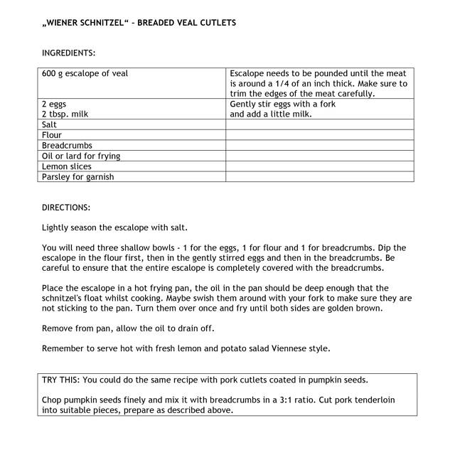 课程一共教了我们三道主菜,一道沙拉和一道甜品,分别是奥地利每家每户都吃的WienerSchnitzel维也纳炸牛排、Goulash匈牙利牛肉汤、Risotto意大利烩饭、Patato Salad土豆沙拉和chocolate mousse巧克力慕斯。