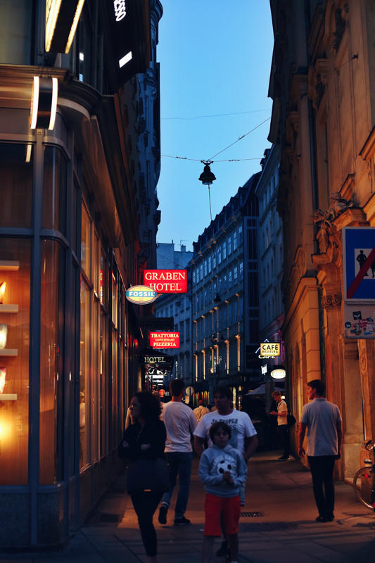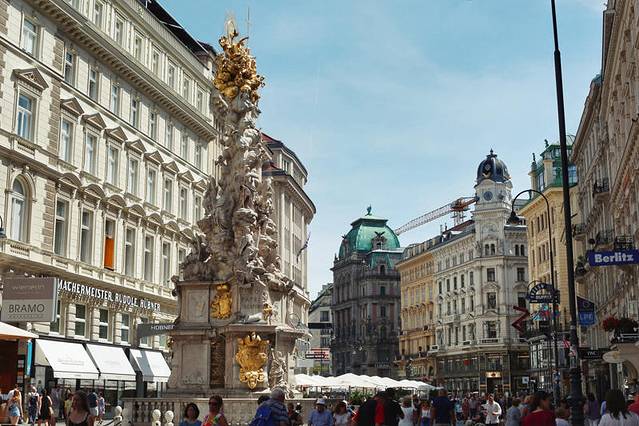 每个城市都有一条人潮涌动的步行街,维也纳的这一条叫做格拉本大街,即使你无意购物也一定会路过这里,道路的尽头就是圣斯蒂芬大教堂,路中央还有欧洲最大的黑死病纪念柱。白天略普通,但日落时分冷暖对比下会显得更为迷人。