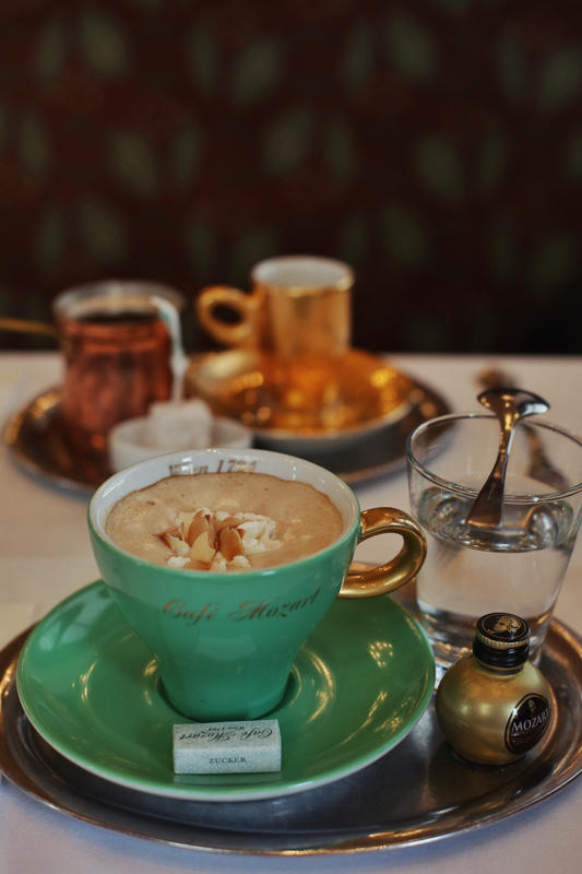 我一直认为,美食是艺术的一条分支。在维也纳,咖啡绝对属于艺术的一部分。握住黄铜门把手,推开那扇历史悠久的大门,充满时代气息的一切展现在眼前:精美绝伦的穹顶,璀璨夺目的水晶吊灯,颇有来头的木制家具,大理石柱与桌面,红丝绒沙发与白色蕾丝纱幔……头发花白的老先生穿着白衬衣黑马甲,颈上系着蝴蝶领结,手中托着的锃亮银盘上,稳稳的放着香气四溢的咖啡、方糖和一小杯白水的。谁又能否认这完美至极的一切,不如莫扎特的钢琴曲一般动人心魄呢?
