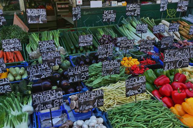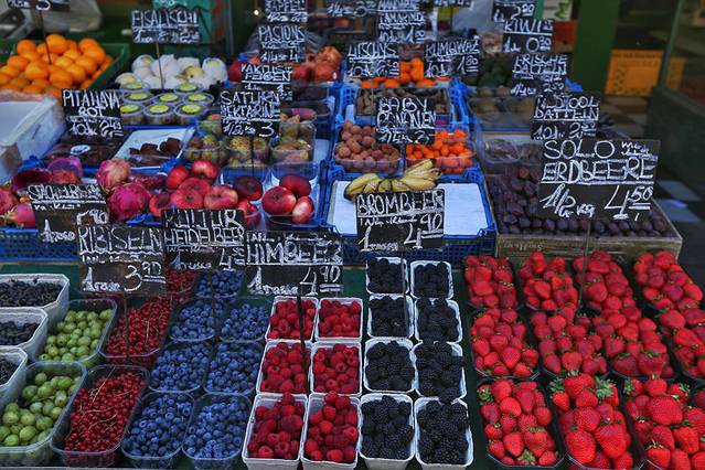要说我这住址选得特别好呢,附近有个热闹的露天市场,叫纳什市场Naschmarkt,是维也纳最大的自由市场。鳞次栉比的摊贩出售着琳琅满目的鲜花蔬果、酒水饮料、熟食奶酪等维也纳人日常烹饪所需物料,还有一些二手货品和旅游纪念品。这无疑是维也纳最有人间烟火味的地方,逛累了不妨就在市场里找个小店,来杯咖啡,坐在店门口的小桌椅上晒晒太阳。