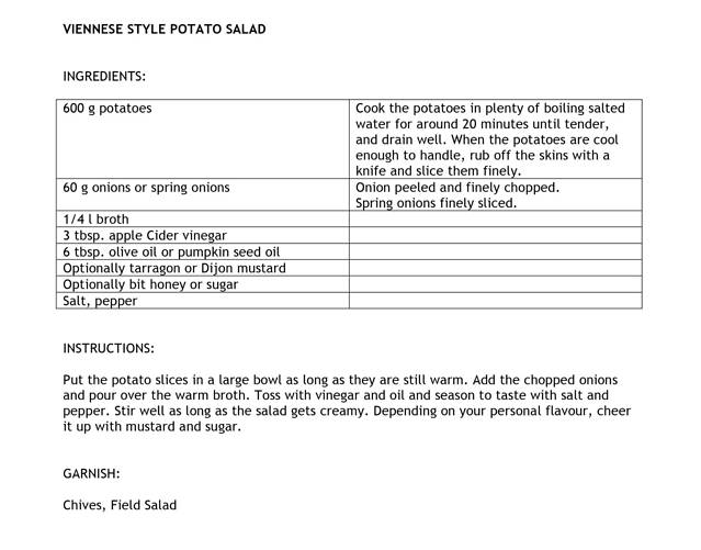 土豆煮熟切片,混合肉汤或蔬菜汤、苹果醋、橄榄油(维也纳当地人用南瓜籽油,国内很难买),然后可以随自己喜好加蜂蜜、第戎芥末酱之类的调料。我觉得苹果醋和蜂蜜混合味道非常好。