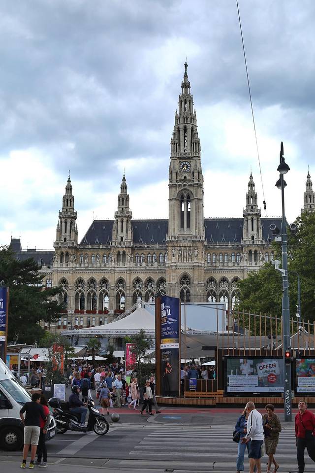 大部分景点都会去到,但只是走马观花停留片刻供拍照留念而已。期间路过了市政厅,市政厅前广场前热闹非凡,这是维也纳的音乐电影节,支起各种摊位贩卖各种美食小商品。