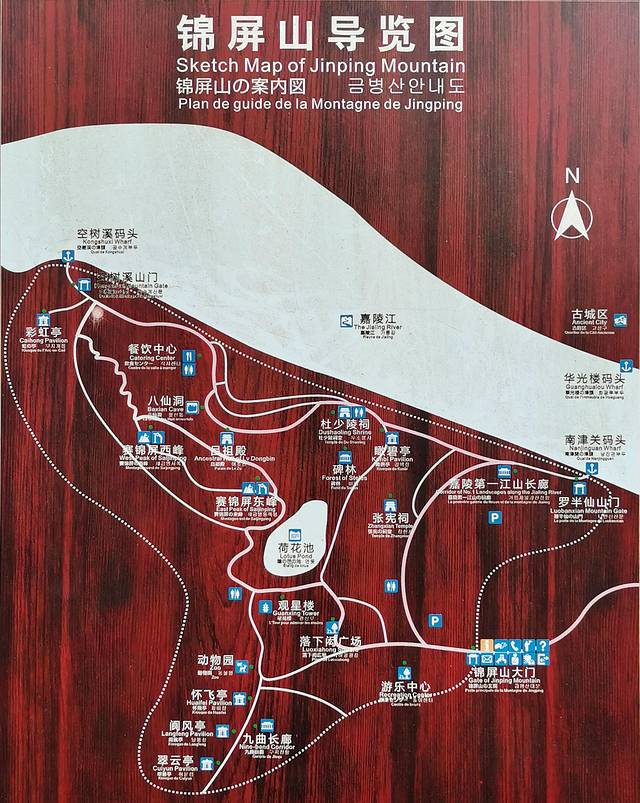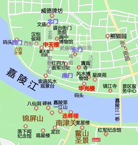 现在城市格局有些变化,城市功能分区各居其所,因城池正对锦屏山,依照风水之说,着意偏西以避江南锦屏山旁的“气口”南津关直冲城市,所以古城“中天楼”往西有“西街”,往北有“北街”,但是往南用“双栅子街”代替了“南街”,往东用“武庙街”代替了“东街”,“南街”和“东街”的名称在南边东边才能找到。