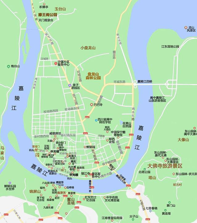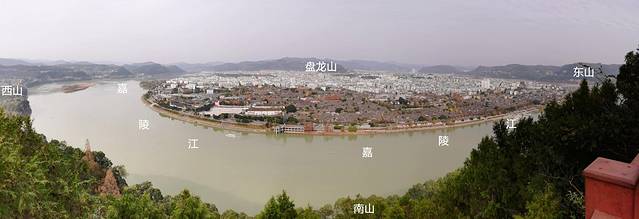 站在积翠亭上,可见嘉陵江往南流去,右边是护卫嘉陵江的“砂山”西山,左边是古城。