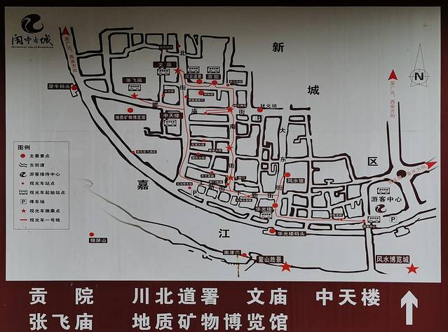 游古城可以从古城东南角的游客中心开始,沿标注的红色路线,把主要景点逛到,并慢慢体会阆中的多种厚重文化。