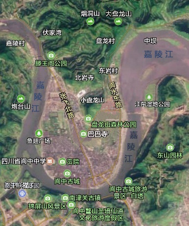 从卫星图中可知,阆中地处四川盆地北缘,嘉陵江的中游。这里是山围四面,水绕三方,山水均呈蟠龙蜿蜒之势。源自“华夏祖脉”昆仑山的大巴山余脉盘龙山系为阆中之“来龙”,与剑门山脉一起护送嘉陵江水从西北而来,于城北形成天然屏障,是为“靠山”。嘉陵江进入城北玉台山沙溪场“入水口”后,在西、南的锦屏山、黄华山、白塔山和大像山等“砂山”的卫护之下,至白塔山 “出水口”后北流,绕古城三面,形成巨大的“U”型环带。这些是“地理四诀”中的“龙、砂、水”。