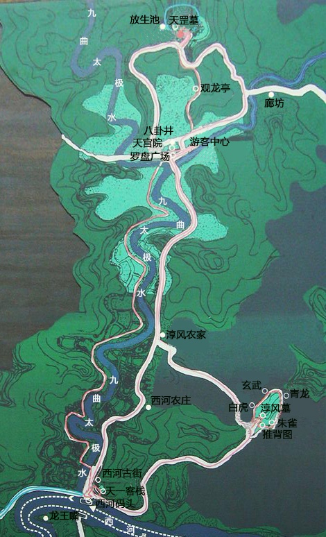 这是重新整理出的现在阆中的全局略图。阆中1995年10月就启动了《阆中历史文化名城保护规范》,围绕风水主体来打造古城,2000年又将其列为“中国风水文化旅游观光目的地”,现在已在国内外大大提高了风水古城的知名度。