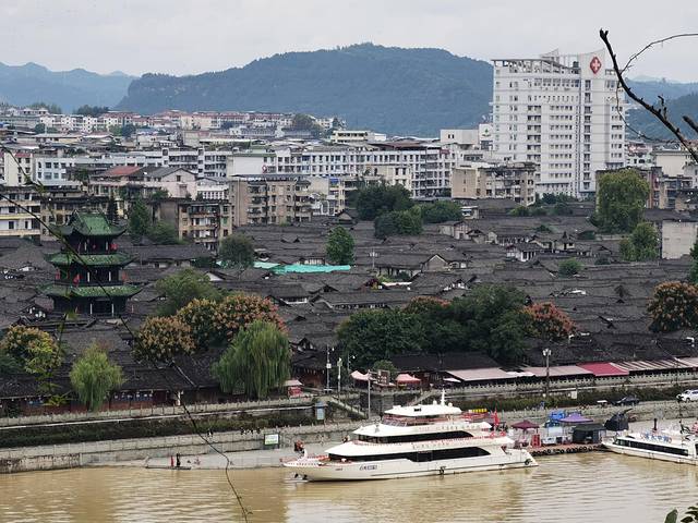 这里观古城的华光楼和江边码头