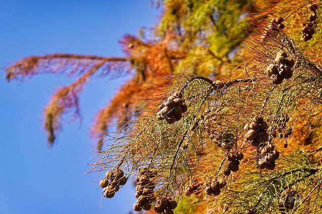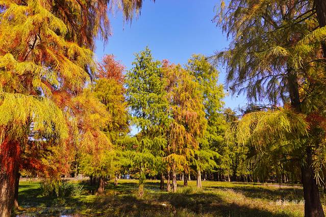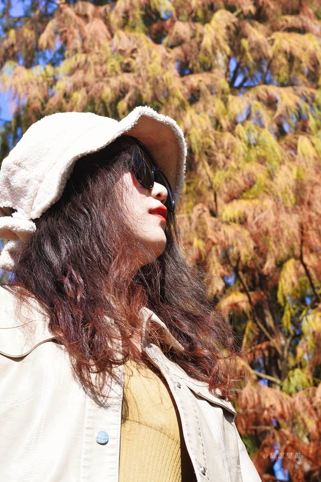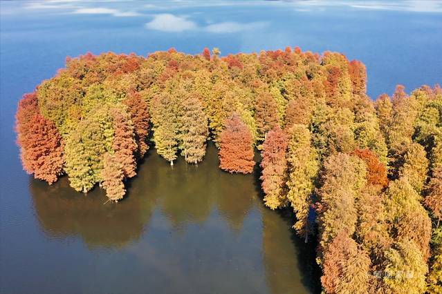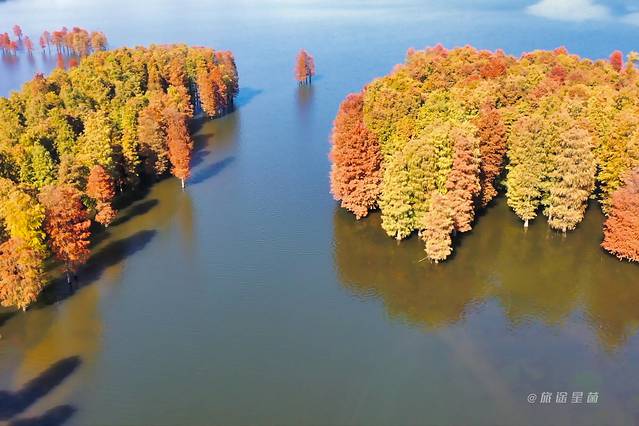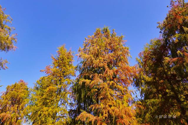 11月底的水杉已经开始泛红,赤橙黄绿的颜色在阳光的斜射下很有层次感,成片的水杉与蓝天白云、微风荡漾的四明湖融成一幅动态的画卷。