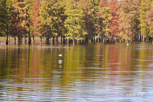 一颗颗水杉矗立在水中,像一座座宝塔,高耸入云,偶有飞鸟掠过,像是也在欣赏水杉的美。