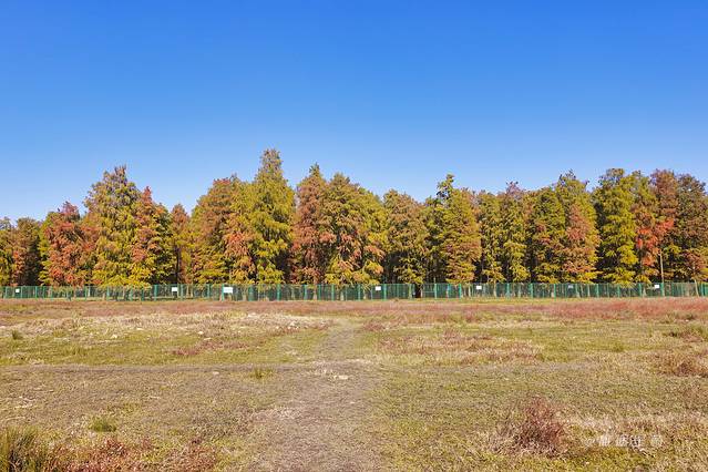 快到水杉林的时候,远远看到水杉被护栏围起来了,心想:完了,踩坑了。既然来了不能就这么走了啊,跟着人群往里走,开了一个小门,听旁边的人聊天得知,四明湖的水位上涨,为了安全起见围起来了。