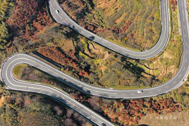 不知道是我们起飞的地方问题,还是个人的技术问题,拍不出盘山公路的大片感,这里好像有飞机飞过,我们设置了限高120米,也有可能是这个原因。不过还是能看出来大弯的。看起来很陡,但是坐车里没有太大的感觉。鹏哥说是他车技好,哈哈哈,暂且相信他,毕竟我不会开。