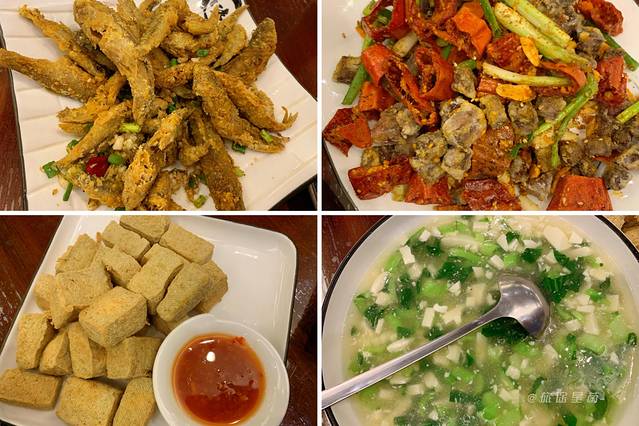 一直拍到太阳完全下山,直接去餐厅吃饭。点了四个菜,其中有一个中午没吃到的椒盐小溪鱼,其他的是臭豆腐、香酥小牛肉、豆腐羹、两瓶饮料,分量很足,味道也不错,鹏哥吃着还不忘吐槽中午的饭,说要是中午的饭是这样,自己下午会更开心。