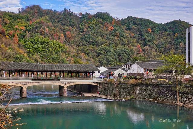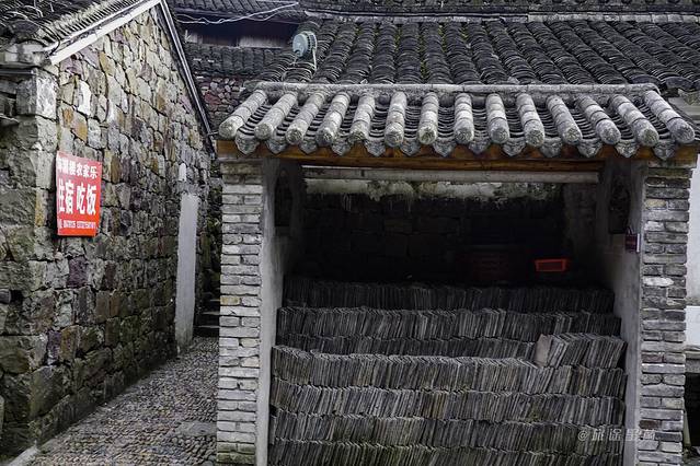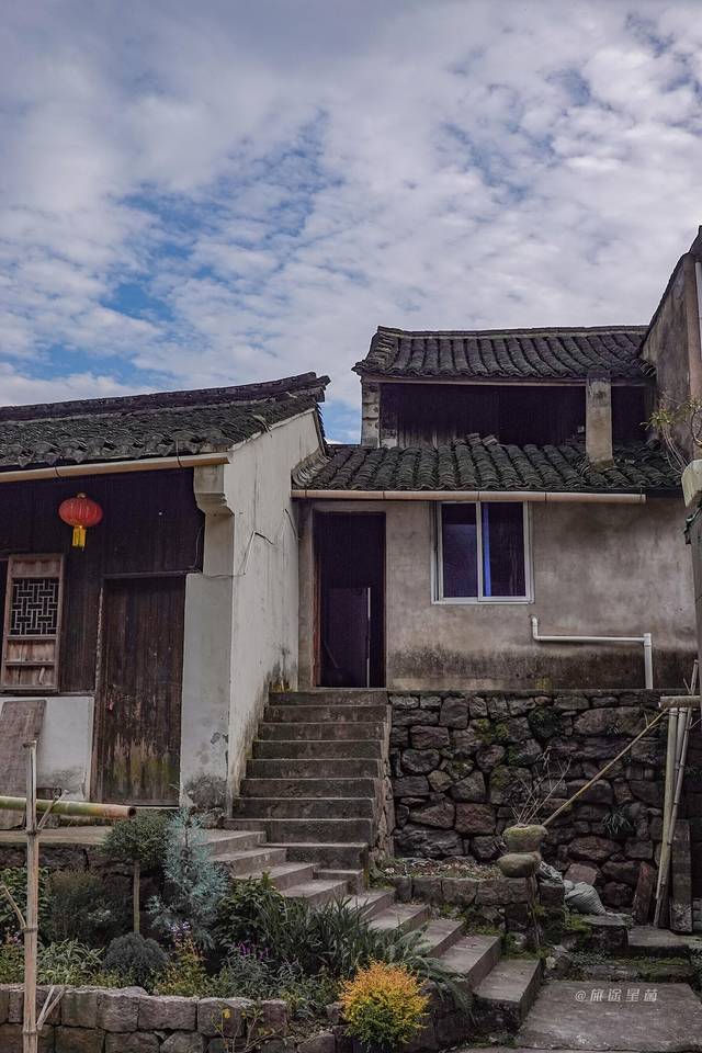 站牌后边有水,碧绿碧绿的,不知道是不是水库流下来的,穿过“四明廊桥”,到村庄了,一座座用块石垒成墙基的四合院遍布村落,屋与屋之间是高耸的马头墙。本来想顺着台阶往里走,看看里边什么样,有个奶奶从身后擦身而过,估计是要回家,怕惊扰了他们的生活,便停止了前进的脚步。