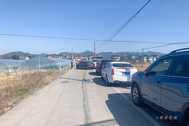 别看是工作日,赏水杉入口处的免费车位已经停满了(附近停车的地儿挺多的,有的可能收费)。停车处到水杉林还有段距离,步行大概5、6分钟,路边有卖特产的:盐焗土豆、土鸡蛋、自酿米酒、梁弄糕等。