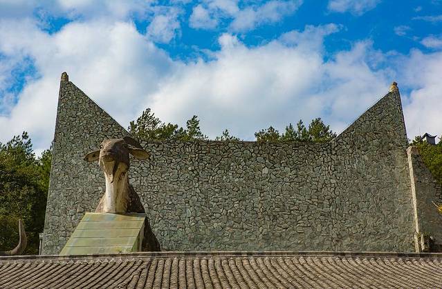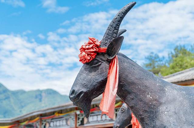 缓缓而上的缆车带着我们到达了山上,眼前是一个满是民族气息的坝子,羊作为羌族的图腾,各个角落都有他们的身影,还有羌族的碉楼,白石伫立,我们俩就仿佛踏入了一个秘境一般,想要去探索更多的奇妙。