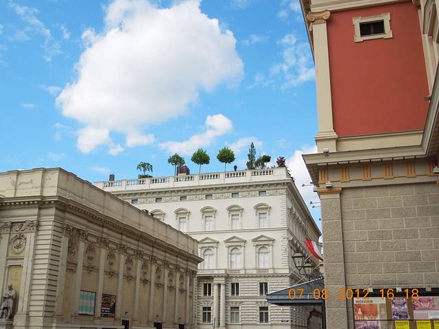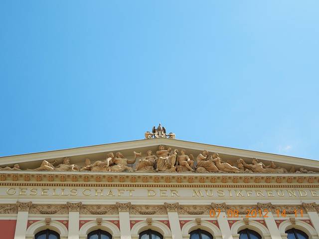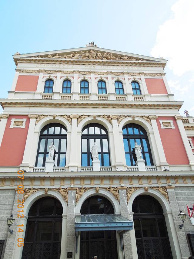 这是我们在金色大厅大楼外拍的合照,当时第一眼看到它,确实和金色大厅那金碧辉煌的音乐厅搭不上边。不过他也许是属于耐看型吧,其实金色大厅的外观也有很多精致的雕像,我现在越看越觉得别有一番韵味。