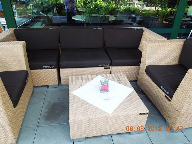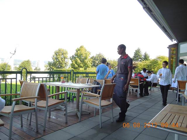 早餐依旧是自助餐,但和昨天吃的似乎不一样,是在另一个厅里的。早餐之前,我们在外面的咖啡桌玩了一会儿,这里风景确实很漂亮。