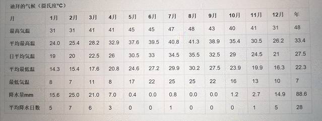 迪拜地处中东地区,属于亚热带气候。一年分冬夏两季,夏季是非常炎热的,最高温度可到50度,瞬间烤化,白天一般没有人出门。11月-3月是迪拜的冬季,平均温度20度,早晚温差比较大,白天最高温度可到30度,即使如此,冬季也是到迪拜旅游的最好季节。