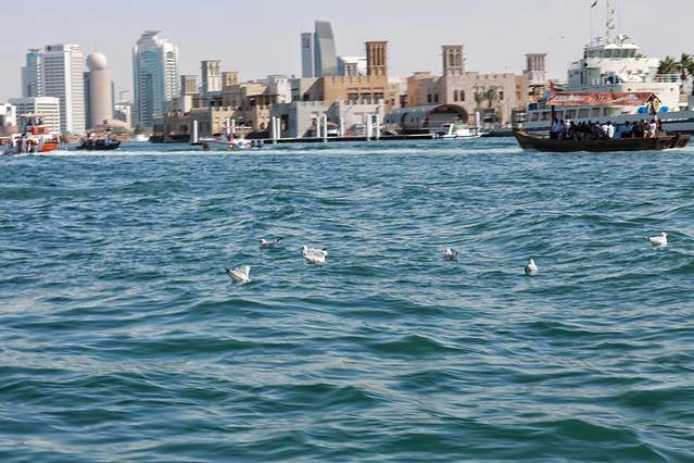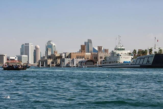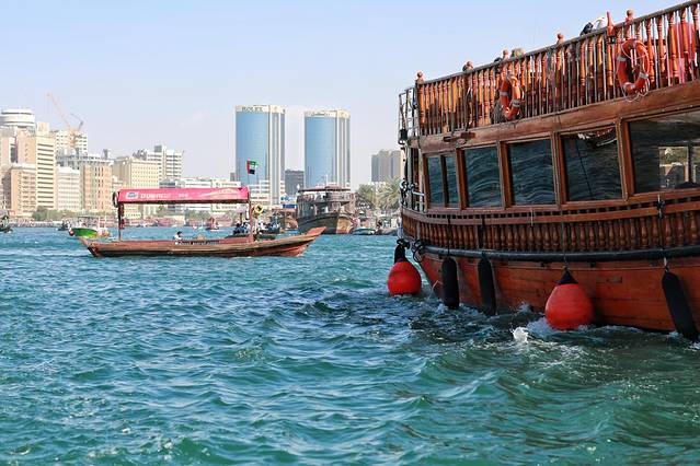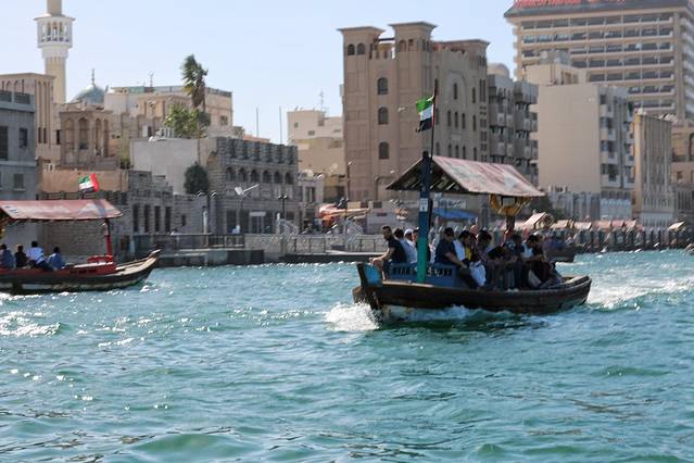 迪拜湾搭乘水上出租,观赏两岸风光,一边是相对古朴的老城,一边是现代的新城。