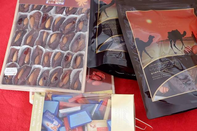 第一类:零食、巧克力,以当地特产椰枣、金骆驼巧克力,甜点为主,共同的特点就是甜。