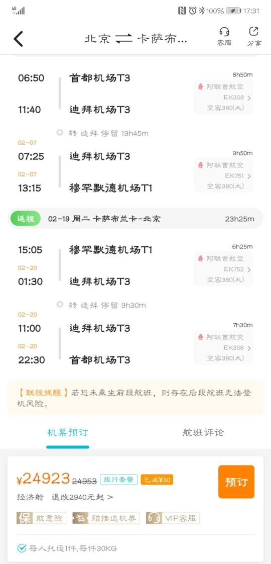 说到订票还是需要一些技巧的,尤其是赶上旺季出行一定要提早下手。这张往返机票我从三个月前就开始关注,最开始的价格是9000多,后来一度涨到10000多。直到12月初,有一天忽然放出几张7000多的票,当机立断抢到手。这个价格不能跟淡季时相提并论,但在春节期间拿到实属不易,后期到了1月底同样的机票如图所示价格已经接近25000元。这时,美女们肯定和我的想法一致,这是给自己赚了不少买包钱啊!