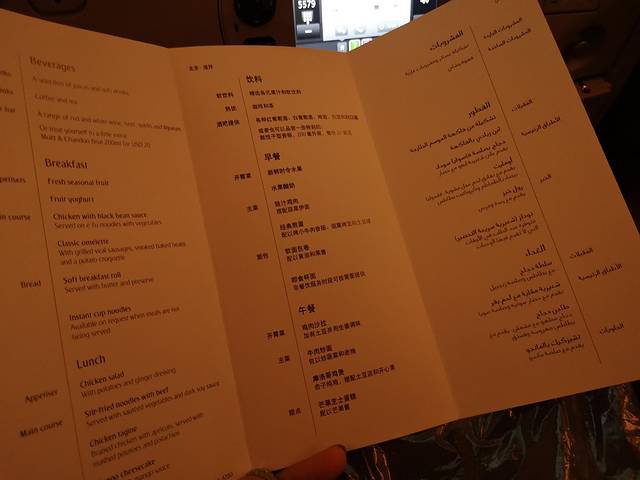 阿航有菜单提供,服务上了档次。论饭菜的味道,从北京飞迪拜这一段还好,比较容易接受,到了下一程飞摩洛哥的时候,味道越来越不靠谱。