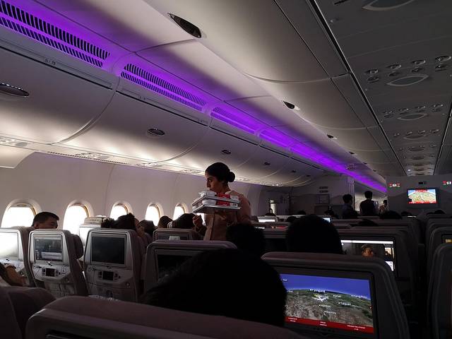 阿联酋航空公司一水A380双层大飞机,长途飞行坐着稍微舒服些。要是混到上面一层的头等舱,哈哈,七扭八歪任你倒。